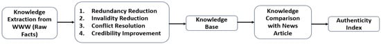 Figure 1 shows the automatic fact-checking process. This process is categorized into two parts: knowledge base construction extraction and comparison checking. In the first part, raw facts and data are represented by the knowledge that is extracted from the web. A knowledge graph is constructed with the help of extracted knowledge. Redundancy reduction, invalidity reduction, conflict resolution, credibility improvement, and completeness enhancement are carried out using knowledge extracted from the web. In the fact-checking process, a comparison is carried out between the knowledge extracted from the knowledge base and the news content that is to be verified to check the authenticity of the news [1].
