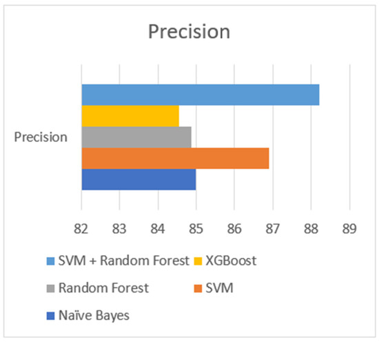 SVMs show better accuracy than naïve Bayes, Random Forest, and XGBoost, as naïve Bayes treats features as independent features and SVMs explore the relationship between independent features to a certain degree, and a nonlinear kernel is used as Gaussian. The output therefore varies depending on the features of problem statement interaction and prediction models. SVMs are better than naïve Bayes. The prediction function shows dependencies between variables that naïve Bayes (y (a, b) = ab) does not catch, so it is not a universal approximator. As SVMs utilize kernel trick and maximum margin principle to work better in nonlinear and high-dimensional tasks, SVMs are the best algorithm of all. It also benefits from the correct set of features and extraction/transformation techniques much of the time. Figure 8 shows the graphical comparison among various parameters.