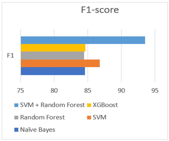 Figure 4 and Figure 5 show the accuracy % and precision % for five different classification algorithms, respectively. Naïve Bayes has the lowest accuracy %, and hybrid SVMs and Random Forest have the highest accuracy %. SVMs have a precision of 86.91%, RF has 84.88%, and XGBoost has 84.56%. Figure 6 and Figure 7 show the recall % and F1-score % of NB, RF, SVMs, XGBoost, and RFSVM, respectively. RFSVM has the highest recall at 92.30% and XGBoost has the lowest recall at 83.90%. RFSVM has the highest F1-score at 93.50%.