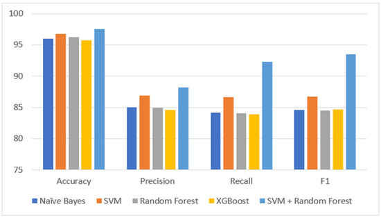 The results have shown that the RFSVM excels in various parameters with an accuracy of 97.56%, precision of 88.21%, recall of 92.30%, and F1-score of 93.50%, compared to the results of naïve Bayes, Random Forest, SVMs and XGBoost. This means that 92.30% (maximum recall) of fake news was detected successfully with our proposed methodology. Table 4 shows the comparison among various machine-learning classification algorithms in terms of accuracy, precision, recall, and F1-score.