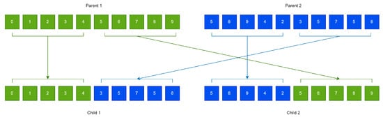 - Execute the crossover procedure: During this procedure, offsprings are produced from the population under processing. For every set of produced children, two distinct chromosomes are chosen from the current population with tournament selection. The offsprings are formulated using the one-point crossover procedure, which is graphically outlined in Figure 3.