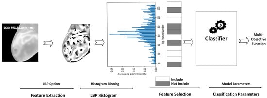 A multi-step methodology is involved in the proposed CAD architecture. While using LBP as a feature extractor, the complete pipeline is indicated in Figure 2 as follows. The preprocessing of breast thermograms is followed by a feature extraction using various texture analysis methods. Next, the extracted features and their histograms are visualized to understand the initial feature vector distribution. Subsequently, the multi-objective function can be used with the proposed optimizers HPSO and HSMO to identify the optimal model contributing significantly to the classification task.