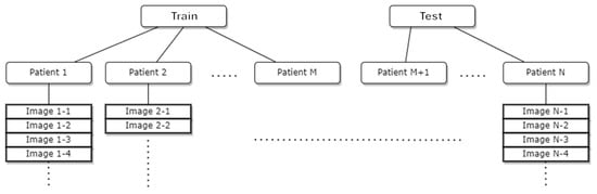 This dataset is a comprehensive collection of individual cases designed for breast cancer detection, with each case linked to a unique ID. It offers diversity in terms of age and demographics, encompassing a broad spectrum of breast cancer risk factors. Each case comprises multiple images. The dataset is segregated into two folders: “old” cases (Desenvolvimento da Metodologia) and “new” cases (12 Novos Casos de Testes), as shown in Table 1. Notably, each ID in the dataset is labeled as either “healthy” or “sick”. Healthy IDs feature images from both the right and left sides of the chest, whereas sick IDs exclusively contain images of the affected side due to the differences in temperature gradients between healthy and sick breasts. The conventional approach treats the data as a collection of images split into train/test/validation sets based on predefined ratios [29]. However, this approach introduces a level of data leakage into trained models since each patient ID can have images in multiple sets, potentially causing overlap between the test and training sets. To mitigate this data leakage issue, we propose creating splits based on patient IDs, where each ID’s images are associated with one of the possible data splits. The division into test and training sets is initially performed based on IDs and subsequently on their associated images. To achieve this goal with our proposed approach, we initially gather the IDs and subsequently divide the ID pool into train/test sets, as illustrated in Figure 3. The dataset was split using a 70–30 train–test split ratio. This split resulted in 1060 samples allocated for training and 462 samples allocated for testing.
