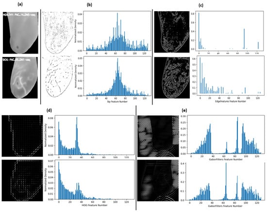 Sample feature extract image and their distributions (a) original cropped image: top left healthy sample and bottom left sick sample; (b) LBP; (c) Canny edges; (d) HOG; and (e) Gabor filter.