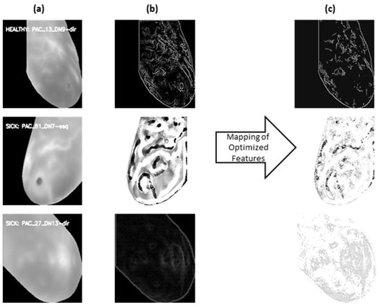 (a) Original cropped image; (b) feature extract image: top using canny edges, middle LBP extractor and bottom using HOG; and (c): selected features mapped back to extracted features.