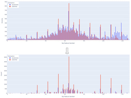 Figure 6 and Figure 7 show the quantifiable aspects of features in the image data. The upper part of Figure 6 presents a chart depicting the extracted features. Complementing these features, the lower part of Figure 6 exhibits a feature graph of the selected features after the metaheuristic-based optimization process. This clear differentiation between the extracted and selected features allows for a look into the model’s preference for certain features over others. Within both figures, the blue bars represent features of the sample healthy image, while the red bars are for a different sample image of the sick category.