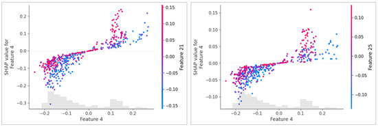 Example of explaining prediction using SHAP plot: the left side after applying HSMO optimization; the right side without optimization, both using an HOG feature extractor. The X-axis represents the value of Feature 4, and the Y-axis shows its SHAP value, indicating its contribution to the model’s prediction. The color gradient represents secondary features (Feature 21 in the left plot and Feature 25 in the right plot), showing their interaction with Feature 4. The optimized model (left) displays a clearer and more structured relationship between features.