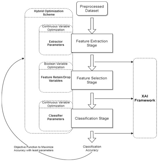 Optimization process flow. Solid Arrows represent the flow of the process between the stages of the CAD system, while Dashed Boxes represent the Hybrid Optimization Scheme and the XAI Framework, which operate in parallel with the process to optimize various parameters at its different stages. The Objective Function evaluates the model’s classification accuracy.