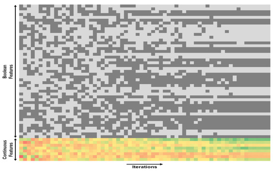 The overall HSMO optimization process. The widening search space at the beginning of the iterations illustrates the diverse solutions explored by the population. Both regions pertaining to binary feature selection and continuous parameter optimization demonstrate convergence as the algorithm iterates. This convergence signifies the collaborative nature of the HSMO algorithm, where local leaders and the global leader guide the population towards more optimal solutions.