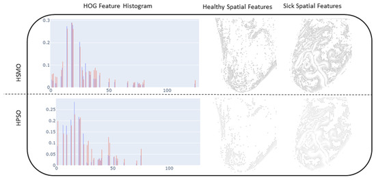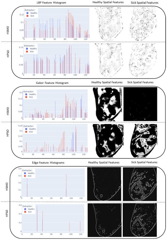 Figure 10 shows a chart indicating the resulting reduction in samples, as well as what the reduction translates to in terms of a visual interpretation of the LBP, HOG, Gabor, and edge features. It can be seen that the histogram of the feature importance distribution using HSMO and HPSO show similar shapes. In the case of an HOG extractor, the feature counts range between 0 and 0.27. The highest peaks occur within bins 13 to 25 for both healthy and sick instances. For the HSMO, the majority of counts fall within the lower end of this range, indicating that the HSMO tends to favor a sparse selection of features by focusing on those that significantly contribute to the model’s prediction. The HSMO optimizer demonstrates a more defined feature density distribution, due to its inherent properties to balance exploration and exploitation. On the other hand, the HPSO demonstrates a more active exploration approach. The presence of higher counts beyond the primary peak range reflects HPSO’s tendency toward broader exploration, driven by its selection of pressure mechanisms.