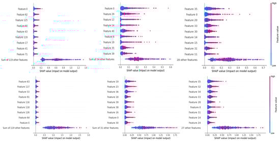Additionally, in order to include another layer of explainability at this stage, SHAP was used to analyze the distribution of feature importance of selected features across the dataset. This step allowed us to assess whether the use of metaheuristic algorithms had an impact on the importance distribution of selected features. Figure 11 indicates the respective feature importance charts of LBP features using a BSMO, BPSO, HSMO, and HPSO optimizer.