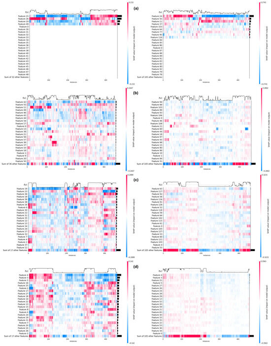 Moving on to the second part of our results, we focused on the application of the leading optimization algorithm, HSMO, with various feature extractors. As the features still remain numerous even after being optimized, in order to gain this insight, SHAP was once again used to distinctly map the per instance ranked distribution of impact score from each top feature of each extractor as indicated in Figure 12 for Edge Filters, Gabor Filters, HOG, and LBP, respectively. The feature importance illustrations are presented in the form of heatmaps, with their placement logically controlled through SHAP in order to highlight any arising patterns. The bars on the right of each heatmap indicate the individual impact of the listed feature in the classification as a whole. The feature distribution becomes unique for each extractor; therefore, in order to assess the impact of optimization, each of the heatmaps is shown in pairs, where the right heatmap indicates the heatmap of all features and the left indicates the heatmap of optimized features.