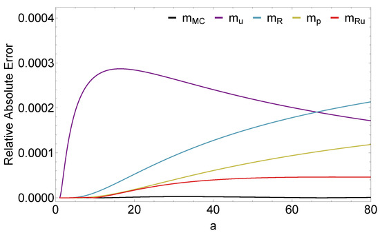 Relative absolute error plot for the values in Table 1 that for a are between 1 and 80 while keeping . We compare the approximation of the upper bound model (Equation (5)) and our proposed model (Equation (12)). We observe a significant difference in the performance of , particularly for higher values of a.