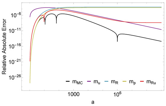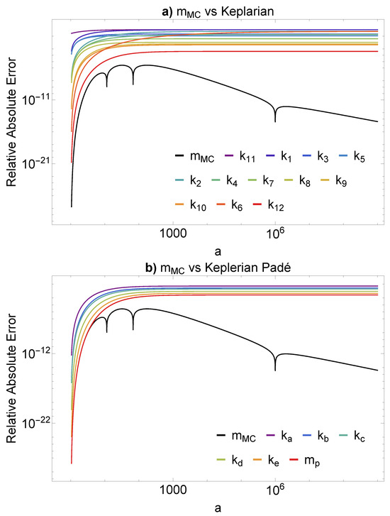 Comparison of the Keplerian and Keplerian Padé equation classes in Sýkora’s analysis in subfigures (a) and (b), respectively. The proposed model (Equation (12)) appears in black in each subfigure, and the axes plot the log of the relative absolute error across the log space between a values between 1 and with .