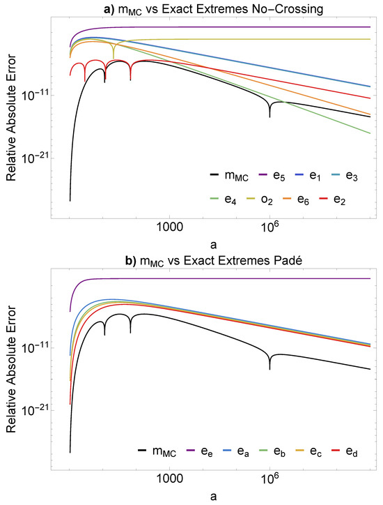 Comparison of the Padé equation classes exact extremes no-crossing and exact extremes in Sýkora’s analysis in subfigures (a) and (b), respectively. The proposed model (Equation (12)) appears in black in each subfigure, and the axes plot the log of the relative absolute error across the log space between a values between 1 and with .