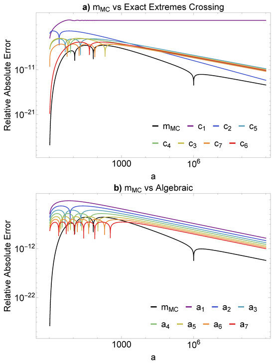 Comparison of the exact extremes crossing and algebraic equation classes in Sýkora’s analysis given in subfigures (a) and (b), respectively. The proposed model (Equation (12)) appears in black in each subfigure, and the axes plot the log of the relative absolute error across the log space between a values between 1 and with .