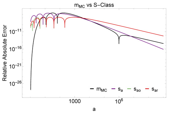 Relative absolute error plot with log scale on the axes, comparing our equation (Equation (12)) with models from Sýkora’s S-class. The equations are evaluated on 10,000 uniform values of a in the log space between a = 1 and .