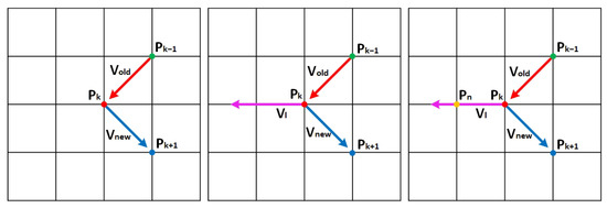 The above dissolution phenomenon only occurs at the current position of the raindrop. Due to the different shapes and trends of rock fractures, the movement direction of raindrops may be completely changed when flowing along the fractures. That is, the motion direction of droplets at the current time and its motion direction at the previous time are different in a certain space. For example, as shown in Figure 3, the droplet starts flowing in the southwest direction ( V o l d ) at the last moment, but it flows to the southeast ( V n e w ) at the current moment.