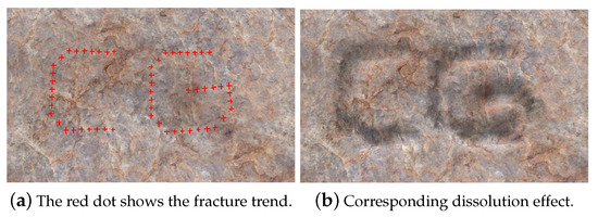 • Lateral dissolution: When the dissolution ditch is obviously curved, the centrifugal force of a droplet will also play a dissolution role on the side wall of a ditch to expand and deepen the fracture. In the horizontal dissolution process under the action of centrifugal force, we calculate the influence area of centrifugal force according to the direction of water velocity, and we calculate the dissolution amount according to water volume, carbonate content, velocity, and centrifugal radius (see Section 4.4).