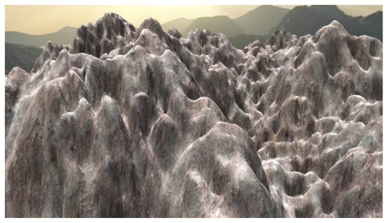 A stone forest refers to a landscape composed of a large number of dense columnar or conical rock bodies, which are generally concave and convex. After heavy rainfall dissolves the rock body, a large number of karst pits and ditches will be formed. After a long time of development, dense columnar or conical rocks will be formed, which together constitute a stone forest landscape. Figure 7 shows our simulated stone forest landscape.