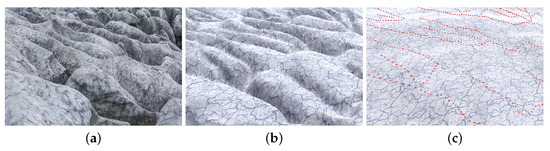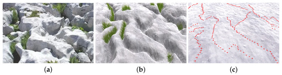 Figure 8. Comparison of a real environment and simulated dissolution erosion effect. (a) Real dissolution scene in the Zhongshan landform. (b) Simulation result. (c) Schematic diagram of initial terrain and fracture trend (red dots).
