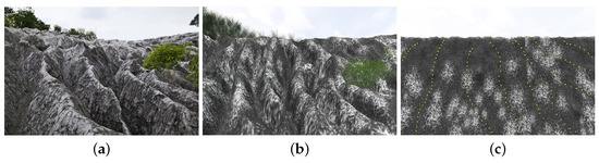 Stone forests refer to landscapes composed of a large number of dense columnar or conical rocks, which can also be interpreted as a concave/convex rock landscape composed of a large number of tall stone buds. The side walls of ditches are mostly steep and straight, with a height of about 10 m [18]. Under the continuous action of strong rainfall, the scouring and dissolution of water flow on the rock body will form deep-cut karst pits and ditches. After a long time of development, these karst pits and ditches will come in contact and merge with each other and then form a stone forest landscape.