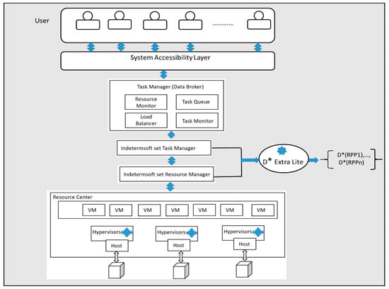 As shown in Figure 1, the Indetermsoft-set-based D* extra lite framework is composed of three distinct modules. The users submit requests to the system accessibility layer. The task manager is responsible for monitoring the resources and tasks. The resource center is composed of a set of virtual machines that are hosted on several physical machines. The uncertainty in the incoming tasks is managed by the Indetermsoft set task manager. Similarly, the uncertainty in the resources is managed by the Indetermsoft set resource manager. The D* extra lite algorithm is executed on the Indetermsoft set of tasks and resources. D* extra lite is also referred to as dynamic A*, which determines an ideal path between the starting point and goal of an application. The obstacles that occur are handled efficiently when they are encountered on the path towards the destination.