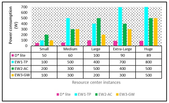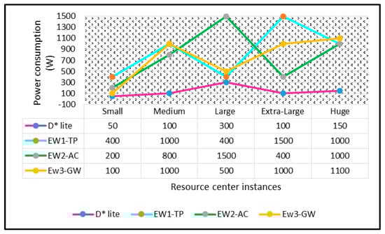 A graph of varying resource center instances versus power consumption is shown in Figure 2. It is observed from the graph that the power consumption of D* extra lite is minimal over varying sizes of resource center instances. The framework is focused and performs smooth matching between tasks and resource instances by finding safer paths. The power consumption of EW1-TP is very high as it performs static classification of tasks as computation-intensive, memory-intensive, and storage-intensive by considering the present traffic scenario and ignoring the history. The power consumptions of EW2-AC and EW3-GW are moderate due to loose function approximation, poor scalability, and inappropriate selection of resources. The workflow model considered in EW2-AC and EW3-GW has limited information about the task parameters which makes it not suitable for real-world situations.