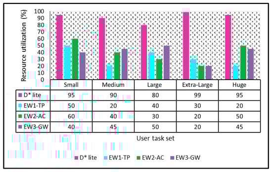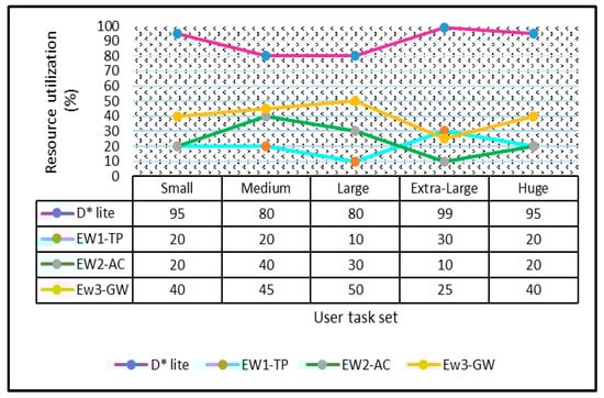 A graph of varying sizes of user task sets versus resource utilization is shown in Figure 3. The resource utilization of D* extra lite is optimal over all sizes of user tasks as it combines incremental and heuristic search strategies for task mapping. The resource utilization of EW1-TP is poor due to improper formulation of the workflow model which does not suit the real-time scenario of cloud systems. The structural features extracted from the tasks are poor, which leads to resource wastage. The resource utilization of EW2-AC and EW3-GW is moderate due to convergence to suboptimal solutions and poor task-routing capability. They are not capable of dealing with a large-state-space environment, and the resource allocation models take longer time to converge to Nash equilibrium.