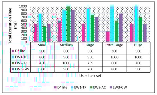 A graph of varying sizes of user tasks set versus total execution time (ms) is shown in Figure 4. The total execution time of D* extra lite is considerably less for all sizes of user task sets due to effective task scheduling despite dynamic obstacles in cloud scenarios. The total execution time of EW1-TP and EW2-AC is very high due to the poor classification of workflow and inappropriate mapping of resources, which cause the execution time to spike. The softmax parametrization also takes an infinite period of time for convergence to promising solutions. The total execution time of EW3-GW is moderate due to poor local search capability and poor convergence rate. Also, the resource management model provides minimal extensibility of a service portfolio.