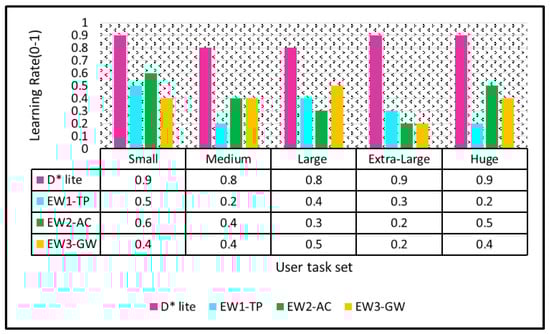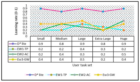 A graph of varying sizes of user task sets versus learning rate is shown in Figure 5. The learning rate of D* extra lite is very high due to high planning efficiency and provides a fast reliable path from user tasks to resource center instances. The learning rate of EW1-TP is very low as it makes poor task-scheduling decisions considering limited information on user tasks. It does not consider the computation-sensitive and storage-sensitive features of the tasks. The learning rates of EW2-AC and EW3-GW are moderate due to low learning accuracy and convergence to low-optimality solutions. They also fail to capture the complexity of real-world situations, and the outcomes of the approach are easily affected by external factors.