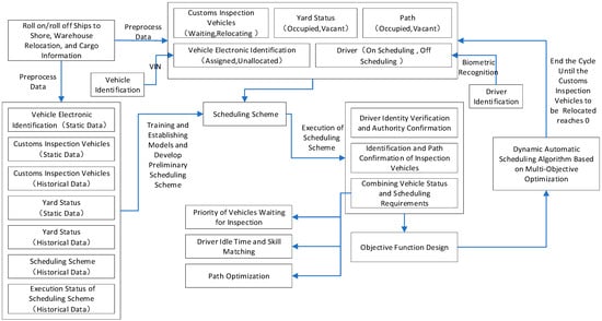 The development of automatic scheduling methods has primarily focused on optimizing scheduling algorithms and improving scheduling efficiency. Traditional methods, such as First-Come, First-Served (FCFS) and heuristic algorithms, have been gradually replaced by automated scheduling approaches utilizing artificial intelligence and machine learning technologies [,,]. Recent advancements in vehicle scheduling, particularly those incorporating deep reinforcement learning, have significantly enhanced scheduling efficiency and system adaptability, although they remain constrained by the operational rules of the research subjects []. Additionally, multi-objective optimization algorithms, such as Genetic Algorithms (GA), Ant Colony Optimization (ACO), and Particle Swarm Optimization (PSO), have been widely used in complex vehicle scheduling problems [,,]. These algorithms optimize scheduling optimization by comprehensively considering various constraints (e.g., vehicle arrival time, priority, yard capacity), significantly improving scheduling efficiency and reducing both vehicle waiting time and yard resource occupancy. Automatic scheduling is crucial in addressing these challenges. By leveraging advanced technologies, customs can optimize vehicle relocation and inspection processes, thereby significantly reducing waiting times and enhancing resource utilization. The integration of Vehicle Electronic Identification (EVI) and biometric recognition technologies represents a novel approach to achieving these objectives. This method not only enhances the accuracy of vehicle identification but also improves security by ensuring that only authorized personnel can operate specific vehicles.