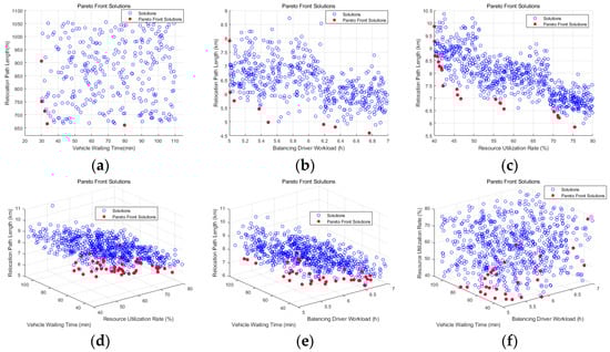 From Figure 4e, it can be seen that the proposed algorithm exhibits a more stable and rapid convergence characteristic in optimizing relocation time (Objective 5). Within the first 40 iterations, the algorithm’s objective function value decreases quickly, approaching the optimal solution area, indicating that it can effectively find optimization solutions in a short period. The convergence curves of NSGA-II and MOEA/D are also relatively rapid in the early stages, and all three algorithms tend to stabilize after the 100th iteration. However, the proposed algorithm maintains better stability compared to NSGA-II and MOEA/D, which experience local oscillations. This suggests that those algorithms have slightly inadequate search capabilities in complex multi-objective scenarios. The proposed algorithm reaches a stable state more quickly, reflecting its advantage in global optimization.