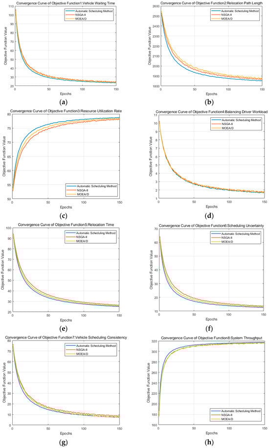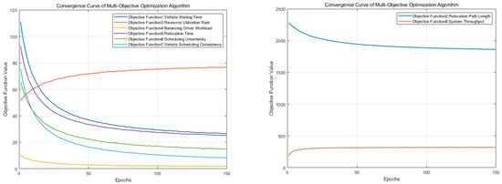 To validate the effectiveness of the proposed multi-objective optimization algorithm for the automatic scheduling method of customs inspection vehicles based on VEI and biometric recognition, an experimental analysis of the convergence performance of various algorithms was conducted. The same training and testing samples were used, and the results of the first 150 iterations were selected to display the convergence curves of the proposed algorithm and classical algorithms (NSGA-II, MOEA/D) under different objective functions, as shown in Figure 4.
