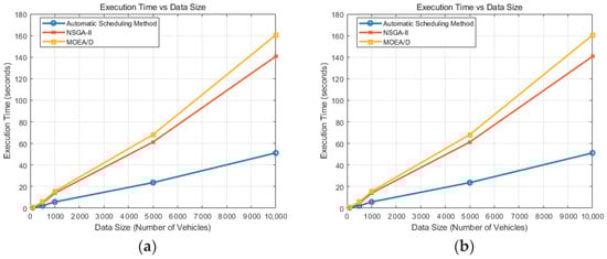 In terms of time complexity, the algorithm’s runtime was tested on different dataset scales (e.g., 100, 500, 1000, 5000 vehicle data). The results indicate that the proposed algorithm exhibits low computational time for small-scale datasets (100 to 500 vehicles), with an average time complexity of approximately . As the dataset scale expands to 1000 vehicles or more, the algorithm’s runtime exhibits polynomial growth, reflecting its ability to handle larger problem sizes effectively. In contrast, the time complexity of benchmark algorithms such as NSGA-II and MOEA/D is higher, demonstrating an growth trend. The proposed algorithm converges faster on large datasets, attributed to its efficient Pareto front solution update and population management strategy. Specifically, on a dataset with 5000 vehicles, the runtime of the proposed algorithm is approximately 30% lower than that of NSGA-II and about 25% lower than MOEA/D.