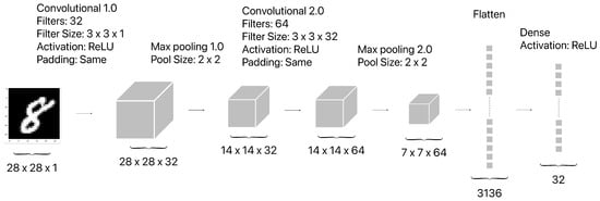Figure 2 presents the proposed encoder used in the autoencoder. As shown in the figure, the first layer of the encoder is a convolution layer with 32 filters (kernels), having dimensions of with one channel. The combination and nature of convolutional layers, max pooling layers, activation functions, dense layers, and vector spaces are optimized for the application under consideration to minimize system resource usage. Padding is added to the input volume as the “same” value, and the stride of the convolution operation is set to 1 such that the output volume has the same spatial dimensions as the input volume. Max pooling is used next with a pool size of . It decreases feature maps by a factor of two in both height and width dimensions. This is considered the first convolutional layer up to this point. During the second convolutional layer, 64 filters that have the dimensions of with 32 channels are employed. The use of 64 filters in the second convolutional layer will improve the ability to extract high-level features from the input data. As the network grows, the number of functions learned at each layer becomes more abstract and advanced. More filters in the second convolutional layer allow the network to capture more complex and detailed features in the input data. Similar to the first convolutional layer, max pooling is performed on the second convolutional layer, and the feature maps are downsampled to a size of with 64 channels. The flatten function is used to convert the output of the second convolutional layer into a one-dimensional array with the shape of 3136 by 1, which can then be fed into the fully connected layers. Finally, another dense layer is created as the bottleneck (latent vector) of the autoencoder with the ReLU activation function, which produces the final encoded representation with a shape of . Though several images are analyzed, within the presentation of this paper, only images from the MISNT [] dataset are considered. The keras [] library is used to implement the autoencoder in Python.