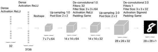 To develop a comprehensive autoencoder model, the accompanying decoder layers must also be defined in line with the encoder model described in the previous section. Figure 3 illustrates the proposed decoder architecture to use in the autoencoder. As shown in Figure 3, with the latent vector, a dense layer in the shape of is defined with the ReLU activation function. The dense representation is then reshaped into a 3D tensor with a shape of with 64 channels, which is then fed into two deconvolutional layers with two up-sampling layers to reconstruct the original input image with one channel. The final layer of the decoder uses the sigmoid activation function. Finally, the autoencoder model is then defined as a sequential model by combining the encoder and decoder layers. It is then compiled with the Adam optimizer with a learning rate of and a binary cross-entropy loss function before training the model. The training data are used for both the input and the output.
