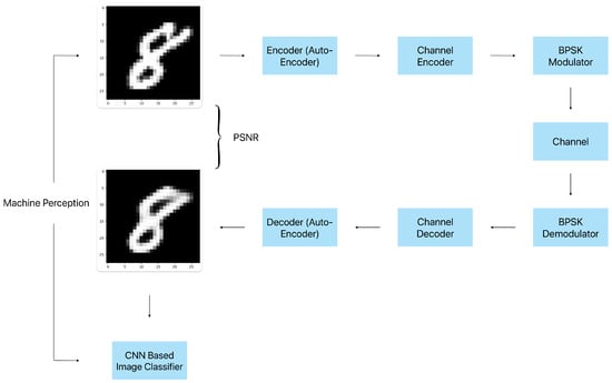 The main idea is to transfer the latent vector through a channel and determine what it implies from the M2M perspective after reconstructing it from the transmission. Since the idea of the SC is to increase the actual information content at a lower data rate, the autoencoder can be used to transmit the minimum number of bits while preserving the original quality of the data. The encoder takes the input data and compresses them into a lower-dimensional representation. The latent vector is then transferred through a channel. On the receiver side, the decoder takes the compressed representation and reconstructs the original data. The reconstructed data are used for image recognition via CNN as shown in Figure 5.