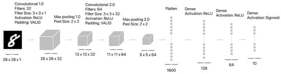The MNIST dataset consists of a training set of 20,000 images and a testing set of 10,000 images, each of which is 28 × 28 pixels in size, totaling 784 pixels per image. Each pixel has a value ranging from 0 to 255. By dividing each pixel value by the maximum value (255), the pixel values in each image are normalized to a range of 0 to 1. This normalization helps ensure that the data are on the same scale, which can improve the model’s performance. The dataset is reshaped into a three-dimensional array with dimensions 28 × 28 × 1. Since the images are grayscale, the 1 at the end indicates the number of color channels. To augment the dataset, random noise is added to the 20,000 training images to create a new set of 80,000 training images.