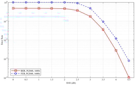 Polar codes, a significant development in coding theory, are denoted by the notation , where N and K respectively represent the block length and the number of message bits. The concept of channel polarization, introduced by Arikan [], involves the transformation of a physical channel into highly reliable and highly unreliable virtual channels as the code length grows toward infinity. This technique has been proposed as an effective method to improve the reliability and efficiency of communication systems. Several studies, such as [,,], have demonstrated the efficacy of polar codes in achieving high throughput or low latency, making them a promising solution for various communication applications. Polar codes can leverage the identification of the most reliable channels by using Bhattacharya parameters [] or Gaussian approximation []. Subsequently, these favorable positions can be utilized for embedding the information bits.
