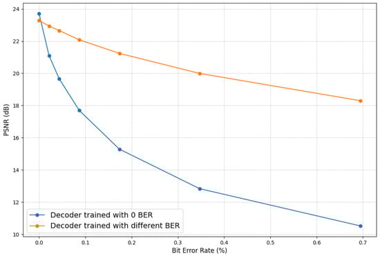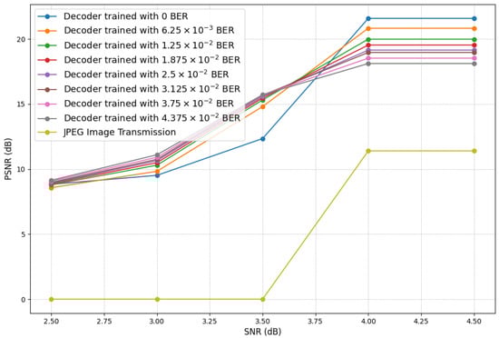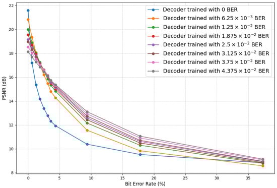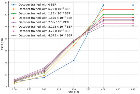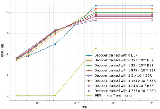 Figure 9 illustrates the quality of received images for a range of BERs (0 to ) under different trained decoders. The observation shows that each decoder has high PSNR levels at zero BER, but the decoders trained with different noise levels have lower PSNR levels compared to the decoder trained with no noise. As the BER increases, the PSNR of the decoder trained with no noise decreases significantly compared to the other decoders. All other decoders have more or less similar performance, indicating that their behavior is mostly independent of the noise levels they were trained with.
