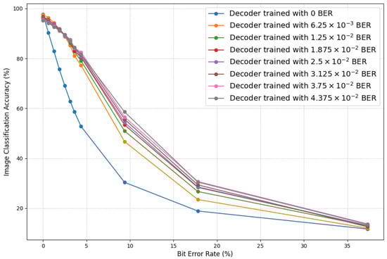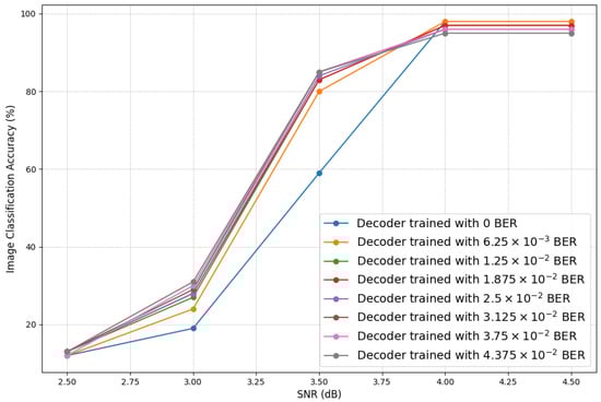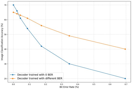 In this experiment, we analyzed the impact of a complex dataset by training a single decoder under several BERs to observe the effects of different noise levels. Figure 11 and Figure 12 present the PSNR and CNN image classification accuracy for different BER levels (ranging from to BER) using the CIFAR-10 dataset, with the decoder trained at various BERs. Similar to Figure 9 and Figure 10, the results show that each decoder achieves high accuracy and PSNR at zero BER. However, at high BERs, the decoder trained without noise performs worse compared to the proposed decoder. This suggests that decoders trained with different noise levels exhibit improvements in both classification accuracy and PSNR under varying channel BERs.