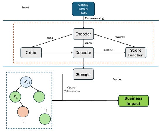 The proposed method consists of two main components: (1) causal discovery through reinforcement learning and (2) causal strength quantification using information entropy. The framework is designed to uncover the root causes of delivery risks by identifying the underlying causal relationships between supply chain variables. We adopt the data-generating model proposed by [31,32], where each variable corresponds to a node i in a d-node directed acyclic graph (DAG) . The observed value of is modeled as a function of its parent variables in the graph, plus an independent additive noise . Specifically,