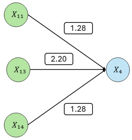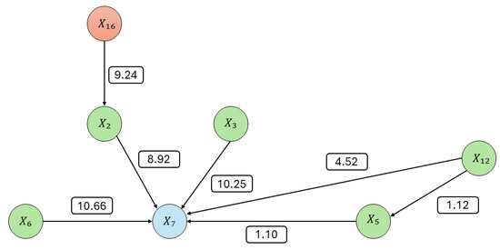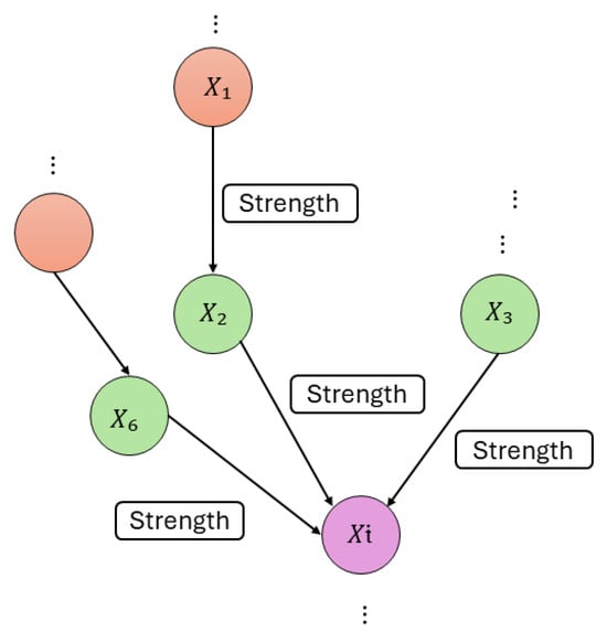 As shown in Figure 1, our model consists of two components: causal discovery via reinforcement learning and the calculation of inverse information entropy (IIE) causal strength [33]. The model processes the observed dataset , where represents the dimensions of the input observations and outputs a causal structure comprising a causal graph G and causal strengths. Figure 2 illustrates the causal structure simulated from the observed data , where S denotes the strength of the causal relationships in graph G.