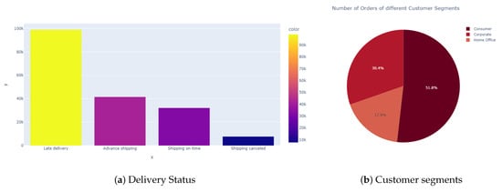 The pie chart on the right (b) provides a breakdown of orders by customer segment (). The majority of orders come from the “Consumer” segment (51.8%), followed by “Corporate” (30.4%), and ”Home Office” (17.9%). This segmentation is important for our analysis, as it may reveal segment-specific factors influencing delivery delays. While it is crucial to understand the different behaviors and risks associated with each segment, we have reservations about whether the customer segment directly causes late delivery. Although segments may impact shipping times, they might not be a direct causal factor for late deliveries, which will be explored in the subsequent causal analysis.