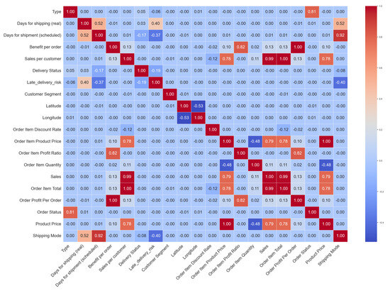 The heatmap visualization in Figure 5 presents the correlation matrix for key features in the dataset. Each cell in the matrix represents the correlation coefficient between two features, with the color intensity indicating the strength and direction of the correlation. Several important patterns emerge from this visualization. For example, “Days for shipment (scheduled)” () and “Shipping Mode” () display a strong positive correlation (0.92), suggesting that the shipping mode may significantly influence, or be influenced by, the scheduled shipment days. Likewise, “Sales per customer” (), “Order Item Total”, and “Sales” are highly correlated, indicating potential redundancy among these features.