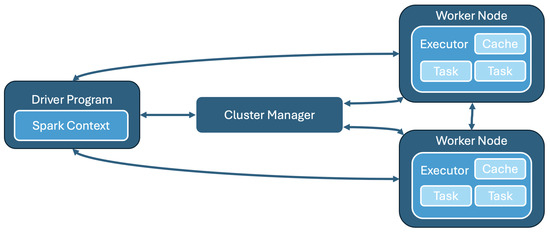 Worker nodes are the machines in the cluster that execute the tasks assigned by the driver program. Each worker node runs an executor that executes the individual tasks. Apache Spark leverages distributed computing by breaking down large data processing tasks into smaller ones that are executed in parallel across clusters of computers, or cores, (seen in Figure 1), enabling efficient handling of large amounts of data processing, improving speed and scalability [20].