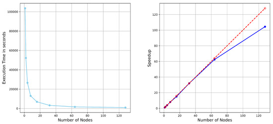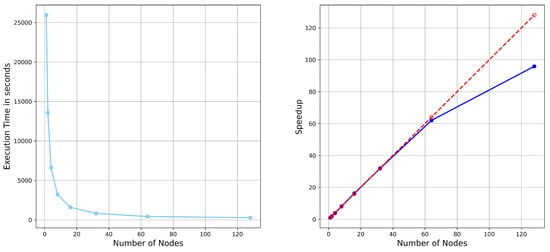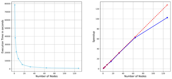 In terms of execution time and speedup for the 1000 dataset, the execution time and speedup are provided in Table 4 and Figure 3. As can be seen, an exponential trend for the execution time is achieved, with the speedup showing closer alignment to the ideal speedup (shown as the red-dashed line) up to 64 nodes. For more than 64 nodes we can see that the speedup drifts off from the ideal speedup.