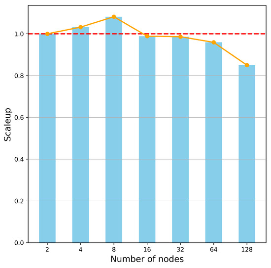 Last but not least, the scaleup results are are provided in Table 9 and Figure 8. Scaleup evaluates how well our parallel implementation of the Bison Algorithm handles increasing dataset sizes as more processing nodes (executors) are added. It basically measures the algorithm’s ability to handle proportionally larger dataset sizes when the processing nodes are scaled up. As can be seen from the table and the figure, we observe a stable scaleup for up to dataset size of 32,000-fold using 64 processing nodes (scaleup = 0.96), with a scaleup declining for the 64,000-fold dataset using 128 processing nodes (scaleup of 0.85). The scaleup using four nodes and eight nodes is slightly higher than 1.0, with values of 1.3 and 1.08, respectively. This could be due to a few reasons, such as improved resource utilization, decreased contention, and more optimal task scheduling.