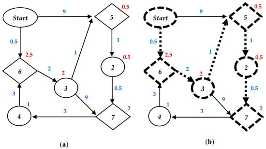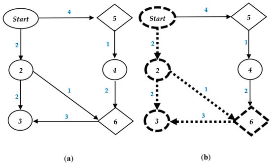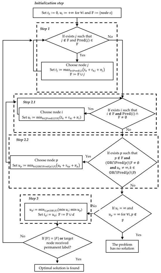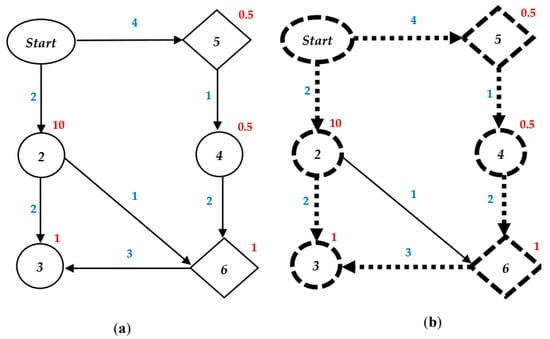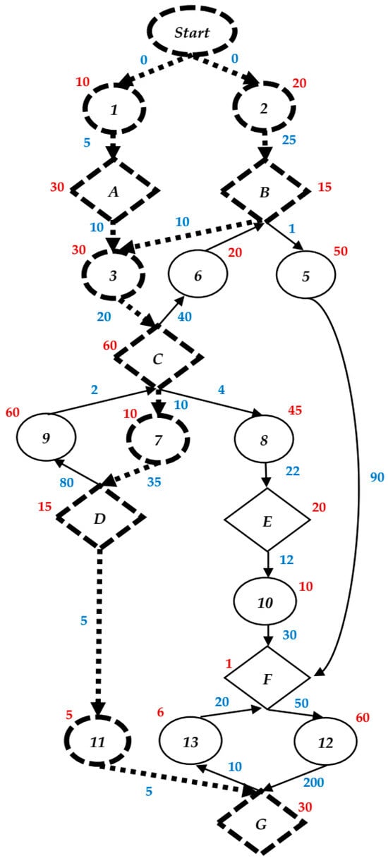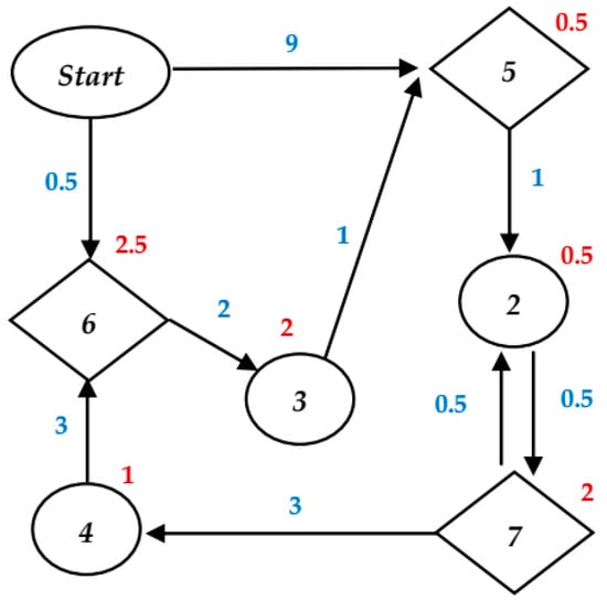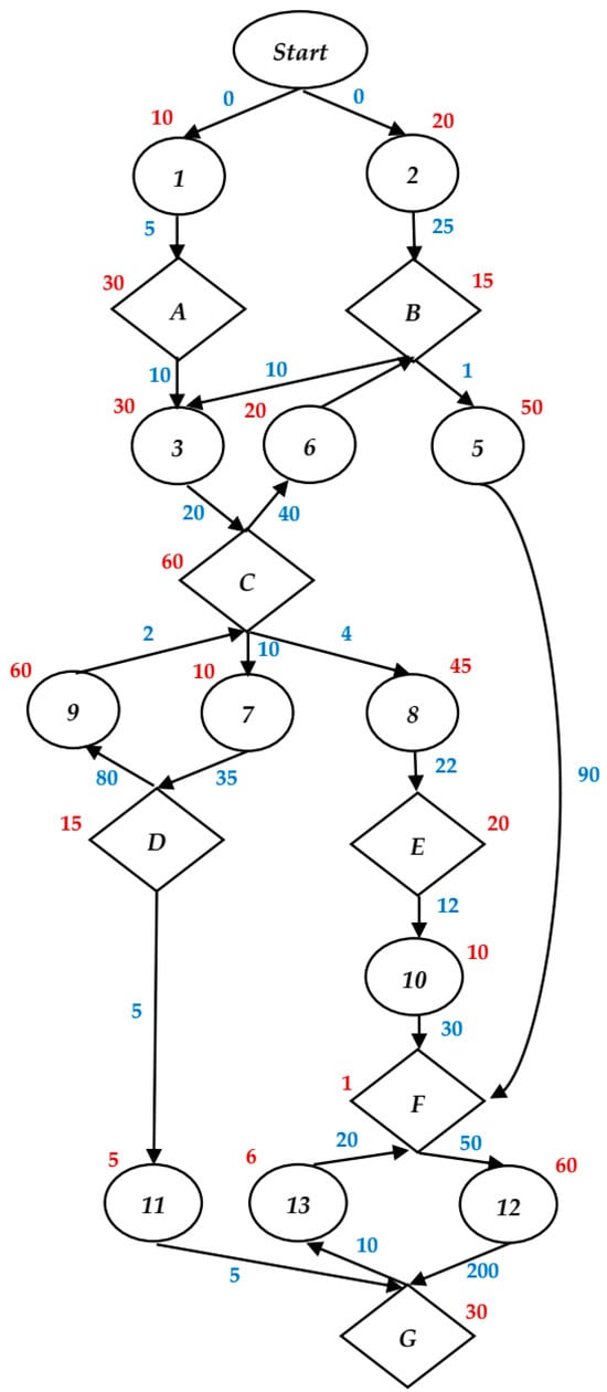 The algorithm solves this example step by step as follows. It starts with the initialization step, in which it assigns a permanent time to the Start node and temporal times (“temporal labels”) to all OR nodes; then, the Start node is added to the set , which stores all nodes with permanent (i.e., minimal) completion times. Next, in Step 1, the algorithm searches for and scans AND nodes for which all predecessors are in the set . Since node 2 in this example has only one predecessor, the node Start, which is already in , a permanent label for node 2 is calculated according to (4), and this node is added to (see the row labeled (1) in the third line of Table 1). The given time parameters are used as follows. According to (4), the permanent time label for node 2 is calculated as follows: , where ; and . At this step, we consider that node 2 has only one predecessor. Note that two other AND nodes, 3 and 4, do not yet have all their predecessors in , so they cannot receive a permanent label at this step, and therefore the algorithm goes to Step 2.